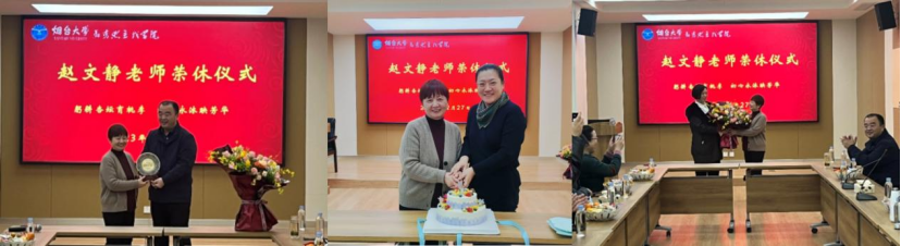 致敬师者,传承精神。副院长郑炜向赵文静老师赠送荣休纪念牌,教师代表吴小妮为赵文静老师献上鲜花,院长王毅和赵文静老师共同切蛋糕,全体参会人员合影留念,会议在温情的氛围中落下帷幕。