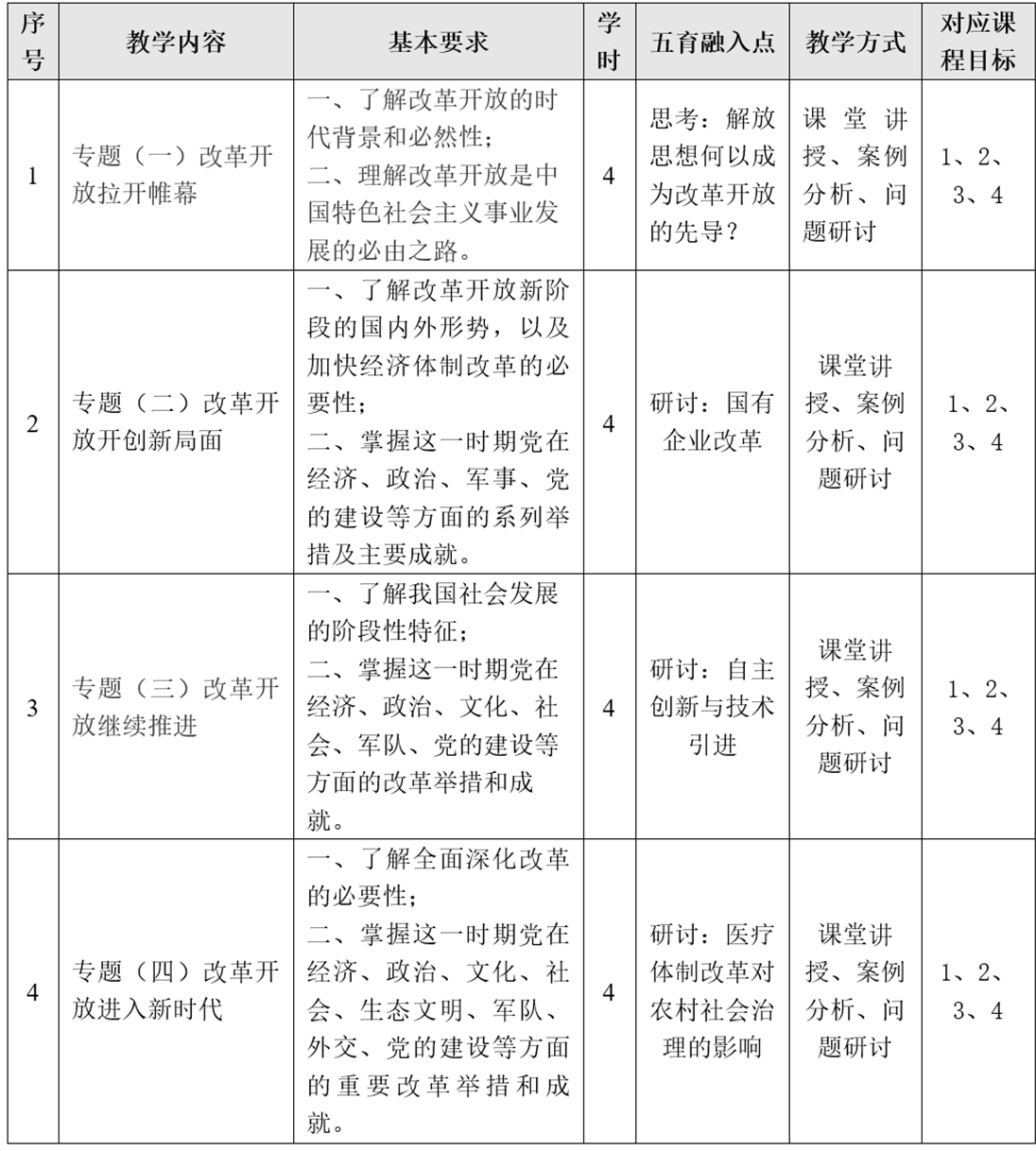 The history of reform and opening-up refers to the history of China after 1978. For more than 40 years, the Communist Party has led the people of the whole country in initiating, upholding and developing socialism with Chinese characteristics. It fully demonstrates the great practice of the Communist Party of China in promoting the self-improvement and development of the socialist system. The course is mainly based on systematic study and theoretical interpretation, using the method of combining theory and practice, history and reality, guiding college students to comprehensively and deeply understand the historical background, development process and basic experience of reform and opening up. To help students understand the opening up and development of the socialist road with Chinese characteristics, and then grasp the role of reform and opening up in promoting modernization and social progress.