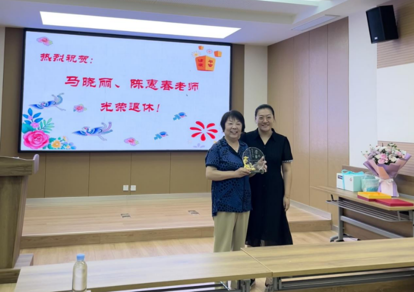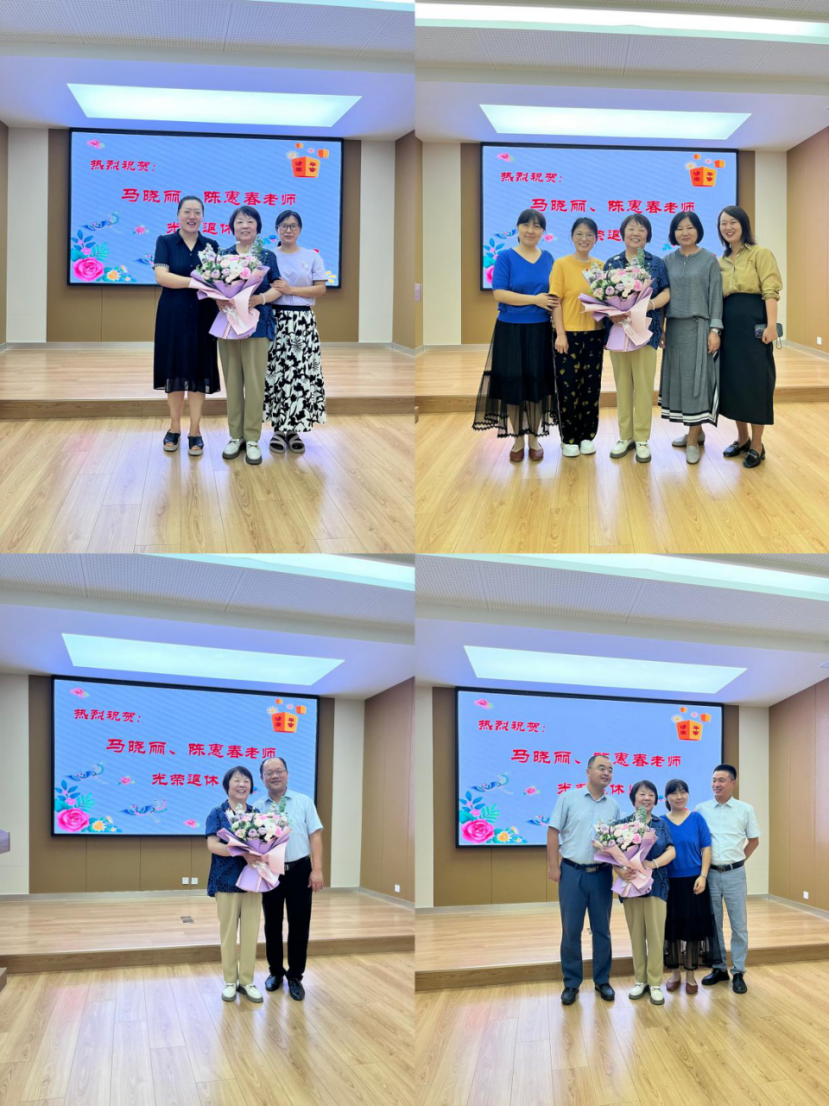 所做的贡献,并代表学院向两位老师的辛勤付出表示衷心的感谢和崇高的敬意,随后献上鲜花、颁发纪念品并合影留念,传递组织的温暖关怀。