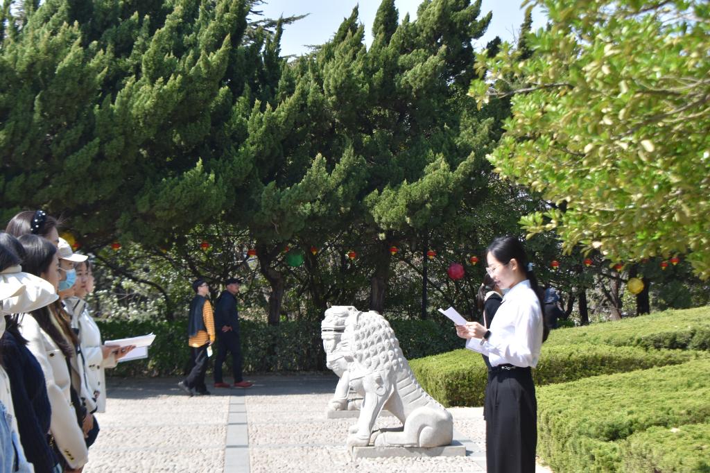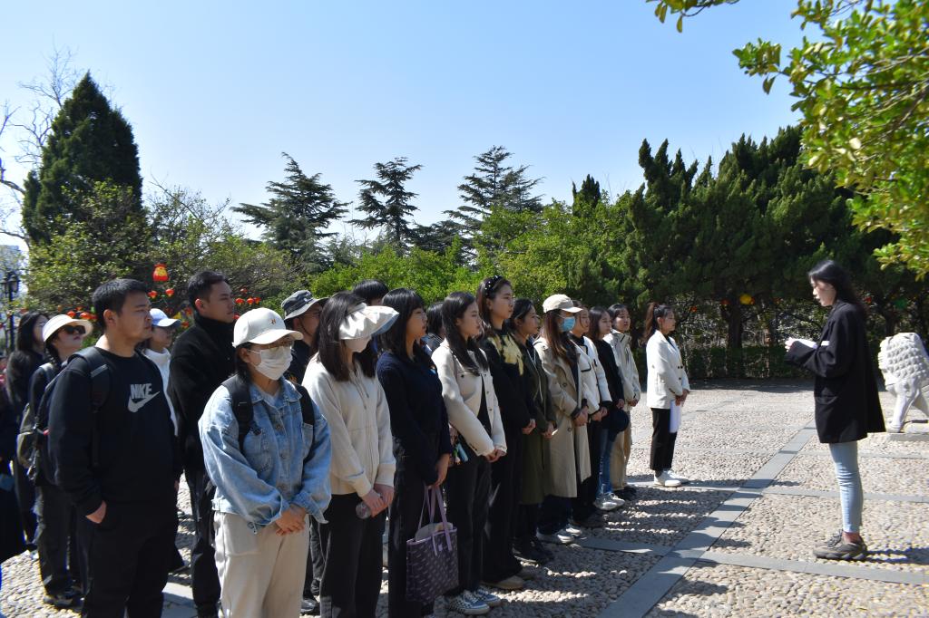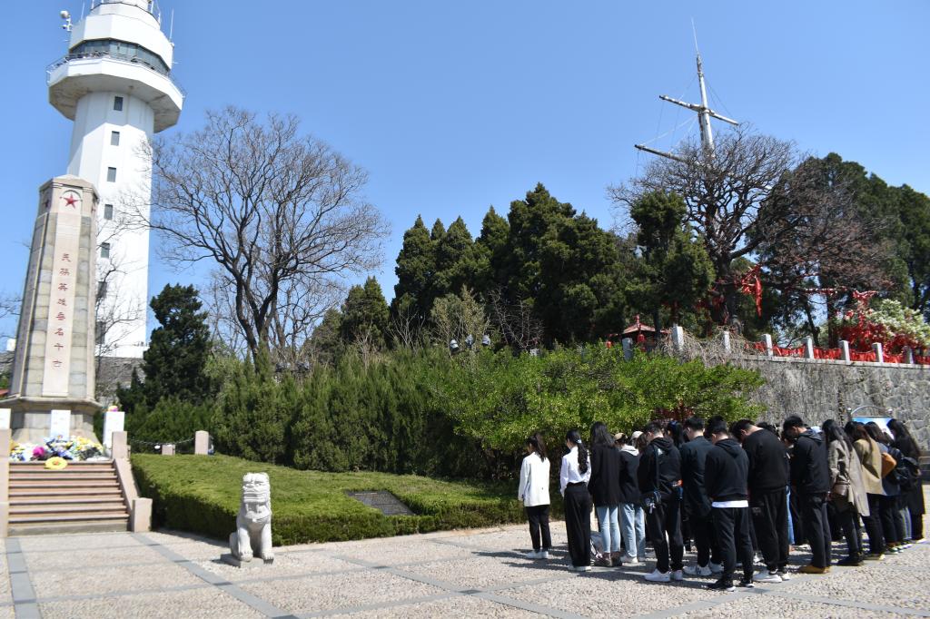 烟台山抗日烈士纪念塔及历史文物遗址主要包括烟台开埠陈列馆、胶东革命史陈列馆、冰心纪念馆、抗日烈士纪念碑。在主持人孟乐瑶的带领下,同学们来到了烟台抗日烈士纪念碑前,高高耸立的纪念碑庄严肃穆的矗立在那里,像先烈们百年前保卫家乡一样,今天依然坚定地守卫着的烟台。主持人简要介绍了烟台山抗日烈士纪念碑的背后的英雄事迹,同学们全体肃立,共唱国歌,集体默哀一分钟,以表达哀思和怀念在集体默哀的一分钟里,我们仿佛能看见、能听到、能真实感受到革命时期那波澜壮阔艰苦卓绝、可歌可泣的壮丽篇章