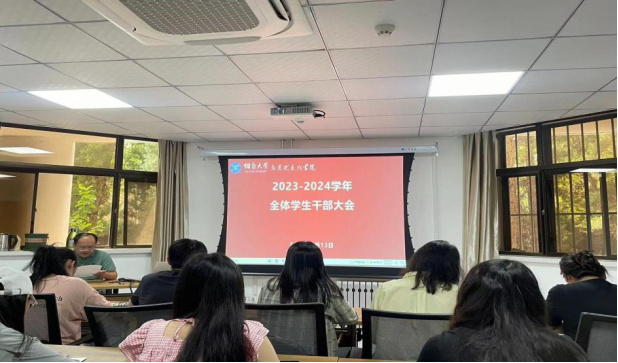 在102教室组织召开2023-2024学年全体学生干部大会,党总支副书记杜德省主讲,辅导员和学院全体学生干部参加。