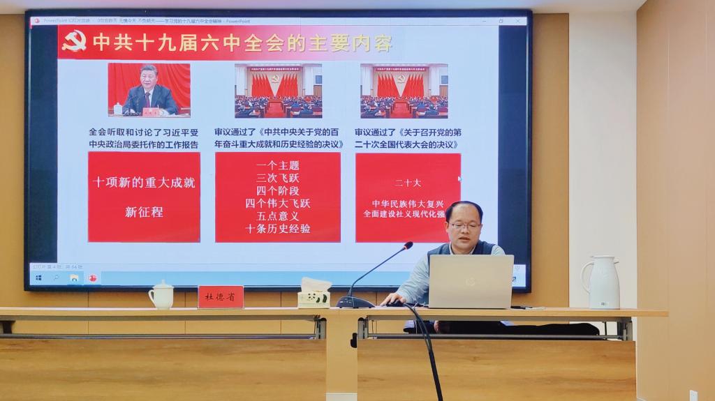 本次党课杜德省书记围绕三个方面进行展开,一是对党的十九届六中全会中对党的十九届五中全会以来中央政治局的工作的充分肯定;二是对总结党的百年奋斗重大成就和历史经验的背景条件、重大成就、历史经验、工作要求四个方面进行阐述;三是对中共二十大将于明年下半年在北京召开的历史方位进行分析。杜德省书记强调,要充分认识党的十九届六中全会的重大意义,加强党的十九届六中全会的学习、宣传和研究。要切实把党的十九届六中全会精神落实到实际工作中,把学习贯彻工作同学党史、悟思想、办实事、开新局结合起来,持续深入学、全面覆盖学,不断增强“四个意识”、坚定“四个自信”、做到“两个维护”。结合十九届六中全会精神,他号召同学们要在马言马,深入学习马克思主义理论,坚定共产主义远大理想与中国特色社会主义共同理想,把个人理想融入到党和人民的共同奋斗之中。
