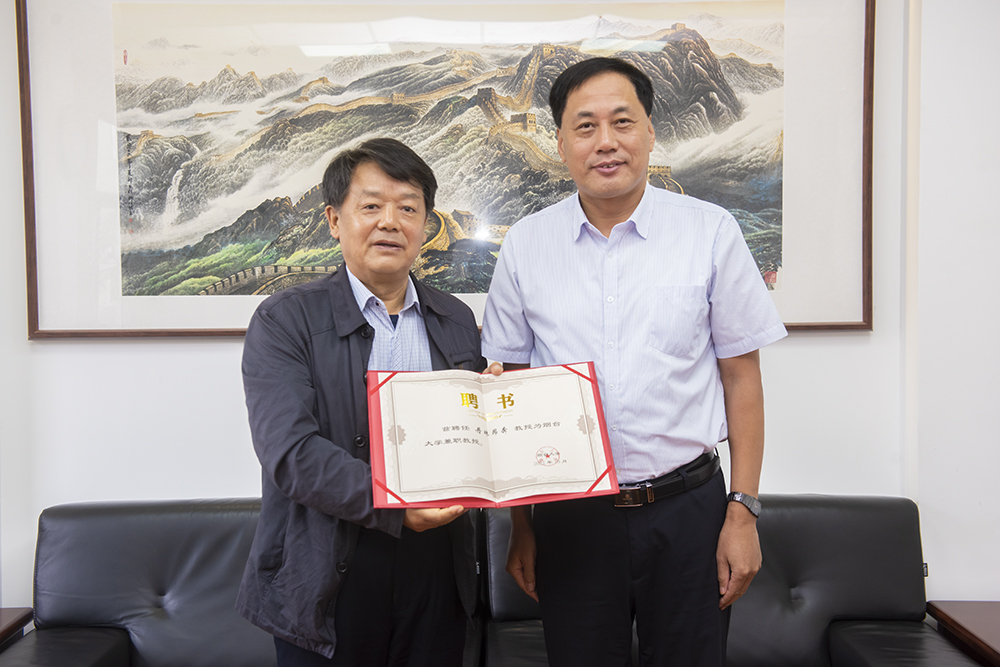 党委书记张殿臣会见丹珠昂奔并代表学校颁发了兼职教授聘书,山东省政协文化文史和学习委员会副主任崔明德主持讲座。