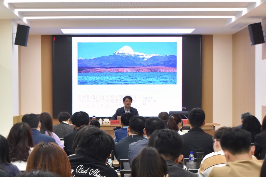 丹珠昂奔以《学深悟透习近平总书记关于加强和改进民族工作的重要思想,不断推进民族工作高质量发展》为题,从“深刻认识学深悟透习近平关于加强和改进民族工作重要思想的三个关键点”“了解民族工作阶段性特征”“完整准确、全面把握习近平总书记关于加强和改进民族工作的重要思想的核心要义”“学深悟透习近平总书记讲到的几个辩证关系”“推进民族工作高质量发展”等五个方面进行阐释和论述。讲座主题鲜明、立意深刻、逻辑性和思想性很强,对深入学习领会习近平总书记关于加强和改进民族工作的重要思想、贯彻落实中央民族工作会议精神、加强和改进学校民族宗教工作有很大帮助。