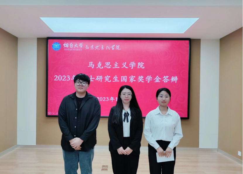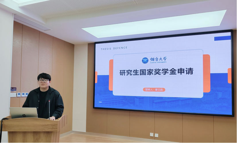 杜德省首先传达了学校的相关文件精神,介绍了国家奖学金的评审细则和答辩要求。经过前期个人申报、学院审核,共有3名同学参与此次答辩。根据抽签顺序,崔红霞、邹蕾、姜文政3位同学依次上台,就思想、学习、科研、社会实践等方面进行答辩展示。