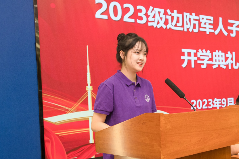 在宣誓环节,新生代表郭佳凝带领全体新生庄严宣誓。铿锵有力的誓言,展现出2023级边防军人子女预科班同学的神采风貌。