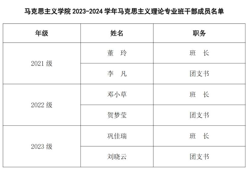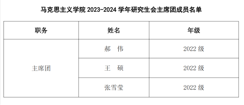 我院研究生会、各班级班干部换届工作顺利完成,本着“公开、公平、公正”的原则,经过资格认定、审核、面试、竞选等环节,并报亚洲色吧 团委同意、党总支审批,现将新一届研究生会、各班级班干部成员名单公布如下: